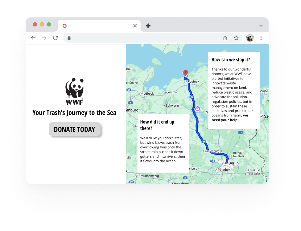 Strategy: Both landlocked and coastal communities pollute the ocean, but coastal communities are more likely to take action against it because they see the harmful effects firsthand. Therefore, WWF must help landlocked communities visualize their environmental impact so they can develop a sense of urgency regarding the matter.